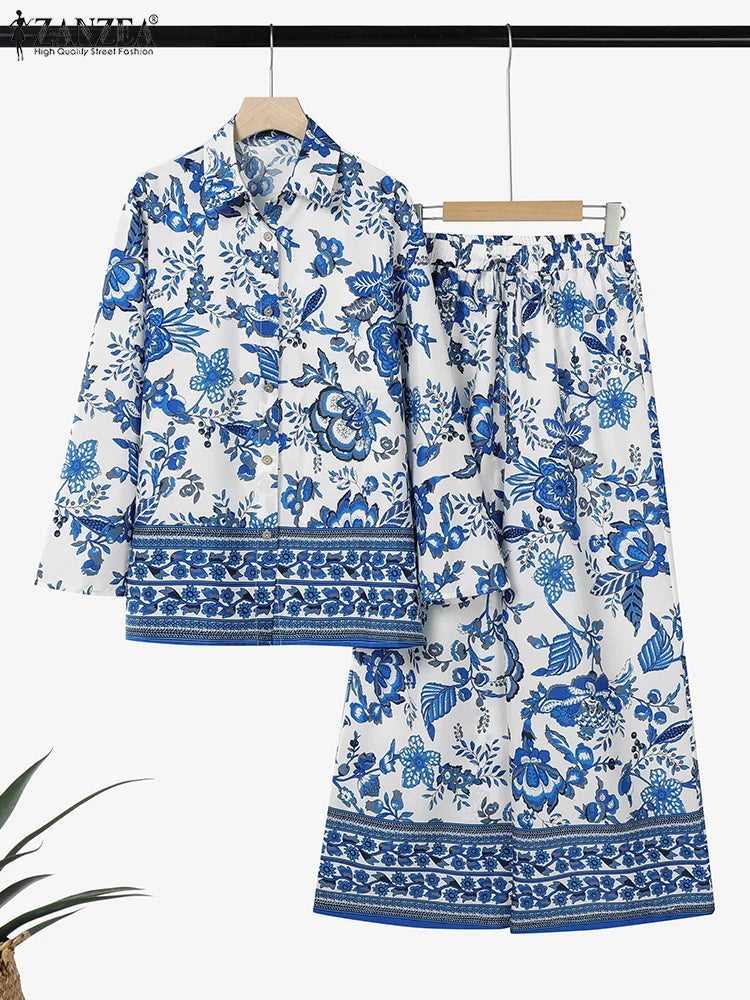 ZANZEA Vintage Women Two-piece Outfits 2025 Fashion Pant Sets Casual Loose Long Sleeve Shirts Elastic Waist Pants Autumn 2PCS